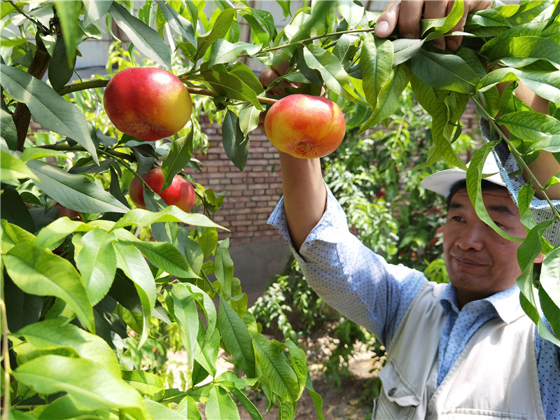 “今年的蟠桃长势好、个头大,很受欢迎,一斤在10元左右。”大棚里,杨勇和几名工人正忙着采摘、分拣,脸上露出了喜悦的笑容。杨勇介绍,一座日光温室大棚一年能够产6000斤蟠桃,预计增收近6万元。