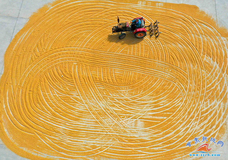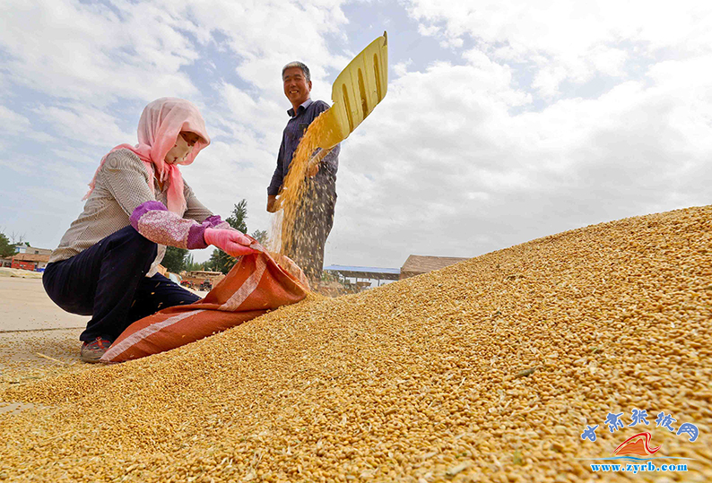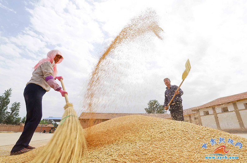 7月13日,临泽县蓼泉镇粮库晾晒基地上,农户们正在晾晒收获的小麦。