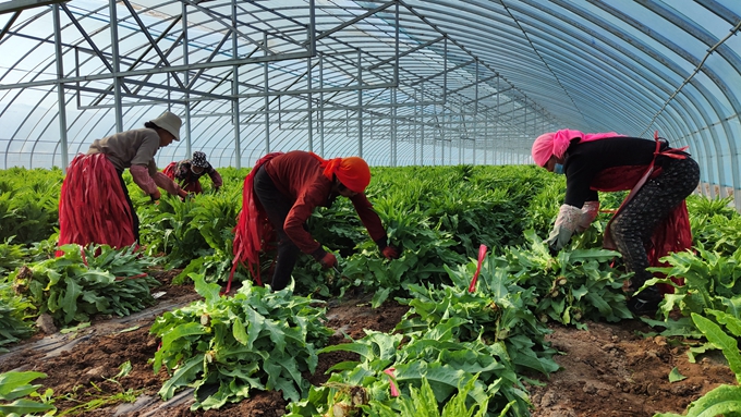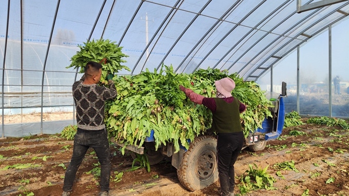 走进山丹县农村产业融合发展示范园设施农业大棚,一片片长势良好、青翠欲滴的莴笋将整片土地浸染得绿意浓浓,一旁正在进行莴笋收割、捆扎、搬运等工作的工人也是忙得热火朝天,处处洋溢着丰收的喜悦。