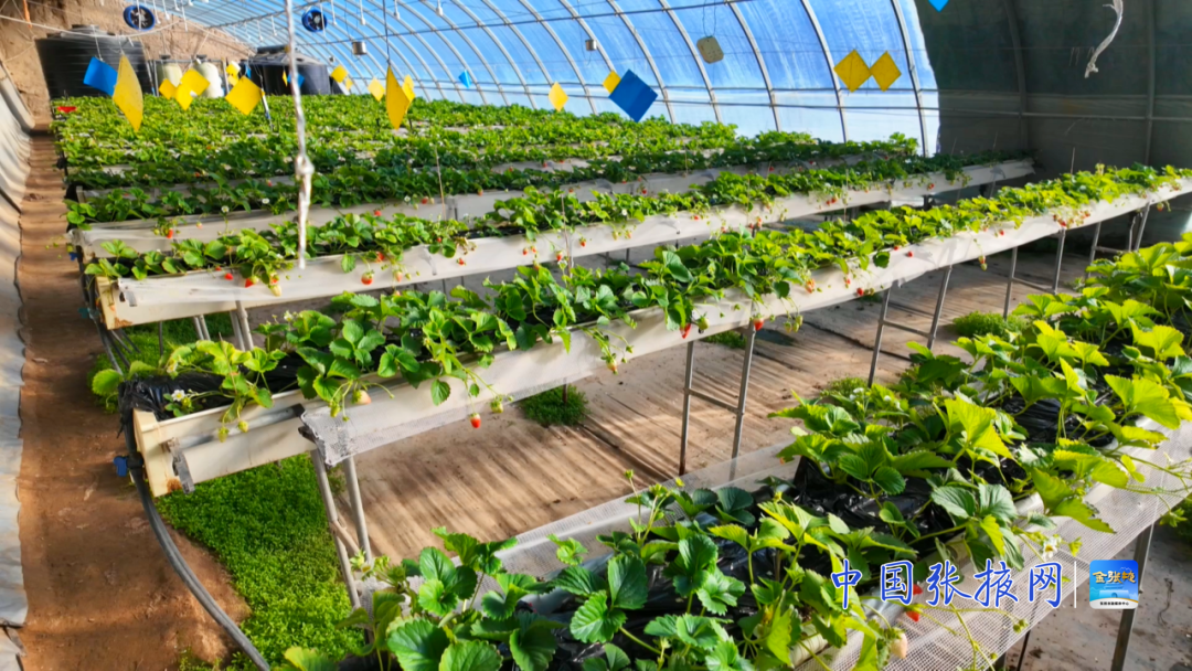 在康翠蔬菜专业合作社的大棚里,红彤彤的草莓和西红柿缀满藤蔓,长势喜人。这里采用的不是传统的土壤栽培,而是高架无土栽培模式。通过基质固定根系,配合自动水肥一体化滴灌系统,实现了智能化的精准灌溉与施肥。同时,棚内科学悬挂的黄蓝板,构成了绿色防虫的第一道防线,有效优化了种植环境。
