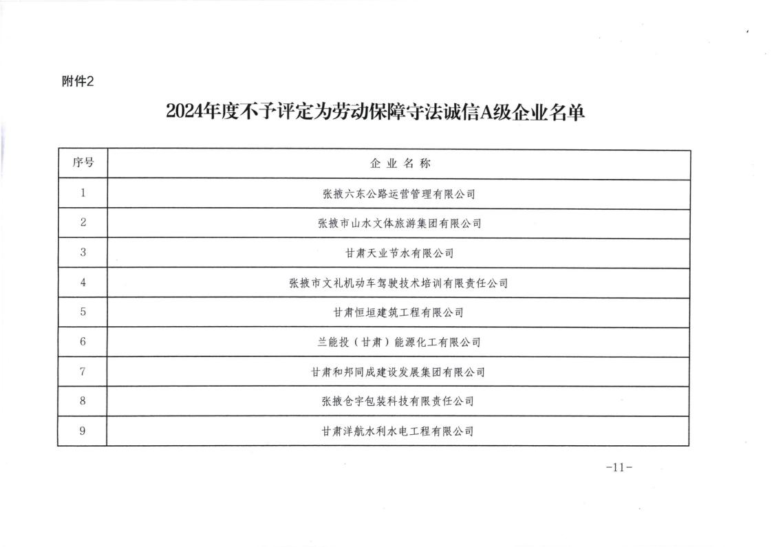 为进一步增强企业守法诚信意识,切实推动劳动保障法律法规贯彻实施,健全完善劳动保障守信激励和失信惩戒机制,构建和谐稳定劳动关系,根据人社部《企业劳动保障守法诚信等级评价办法》(人社部规〔2016〕1号)和省人社厅《甘肃省企业劳动保障守法诚信等级评价实施办法》(甘人社通〔2017〕161号)规定,按照《关于开展企业劳动保障守法诚信等级评价工作的通知》(张人社通〔2025〕20号)要求,市、县(区)认真开展了2024年度企业劳动保障守法诚信等级评价活动。评价活动结合劳动保障年审、日常巡查、专项检查情况,按照企业自主申报、县区人社局审核、征求相关部门意见、市评价活动小组复核、评定结果公示、局务会议审定、命名通报等程序开展。经局务会议研究决定:山丹马场三场有限责任公司等245户企业评定为2024年度企业劳动保障守法诚信A级,张掖六东公路运营管理有限公司等9户企业不予评定为2024年度劳动保障守法诚信A级。