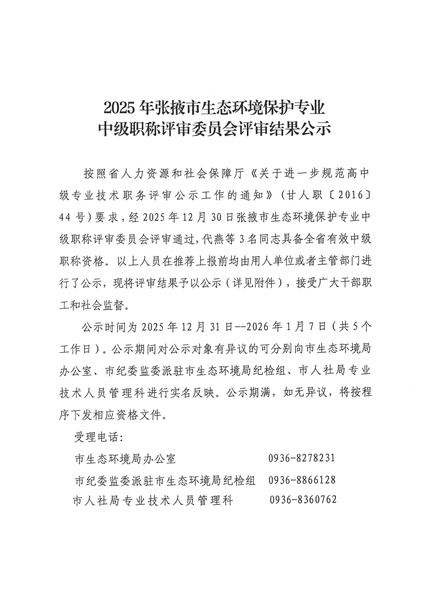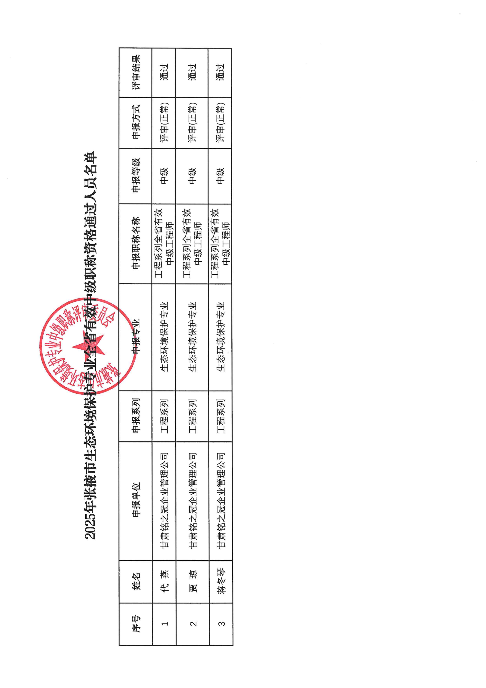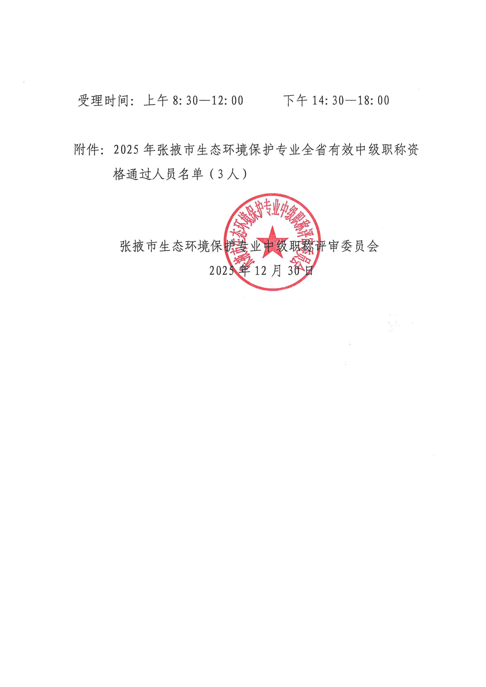 2025年张掖市生态环境保护专业中级职称评审委员会评审结果公示
