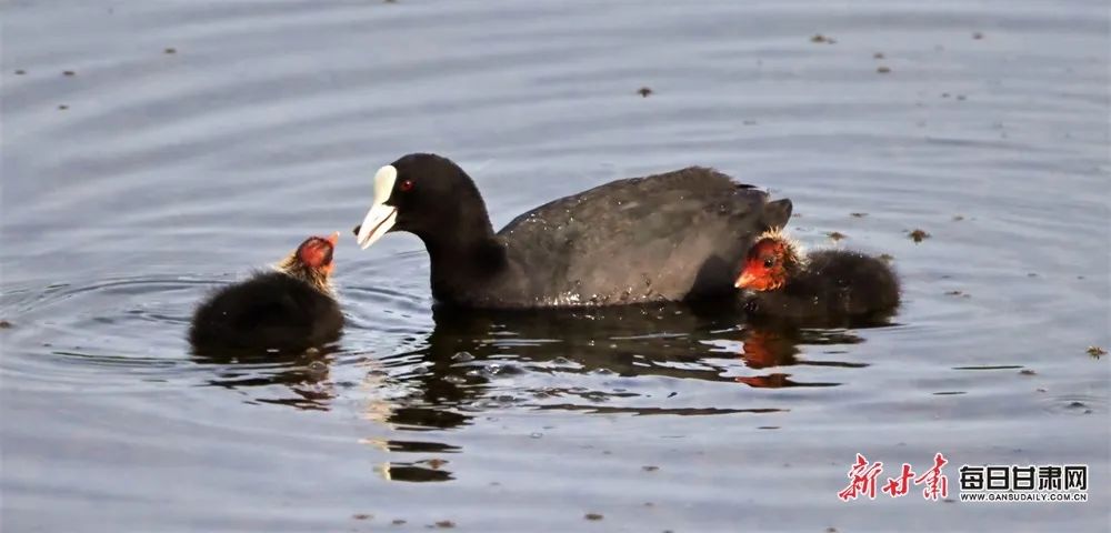 芦苇丛中、水面上,雏鸟们或爬在妈妈背上、或紧紧依偎在妈妈身旁,成年候鸟机警捕食、细心投喂,构成了一幅幅温馨、和谐、灵动的生态画卷。