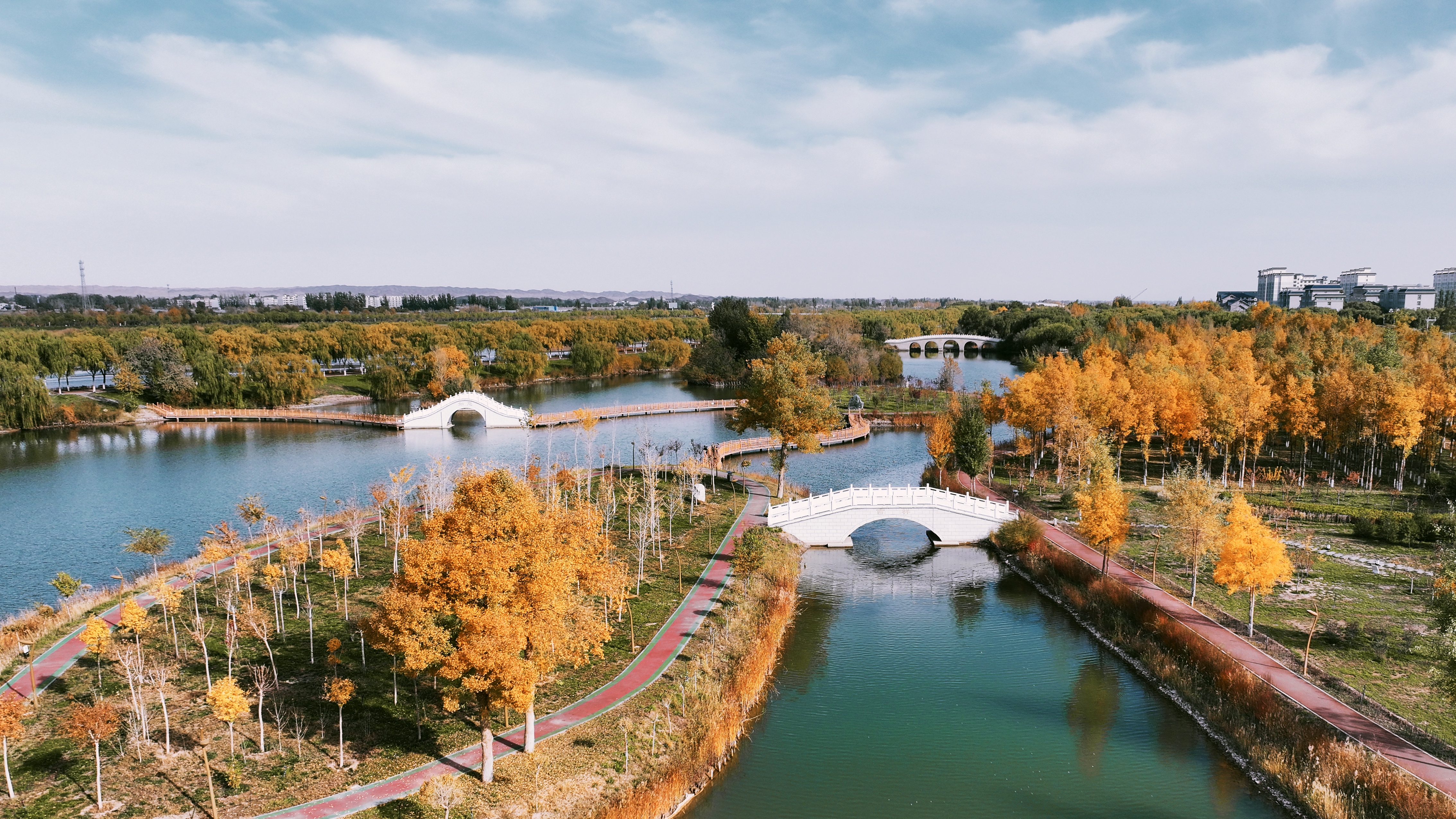 这里的深秋,温润得成熟,丰满得优雅,幸福地分娩。秋风挟裹着五谷的香气,抚摸着瑶林的身躯,诉说着丰收的情语,撒下一地金黄。润玉苑里禅噤荷残,偶见早霜。锦鳞广场藤架上的地锦红得发烫,道边一棵绒毛梣宛若百年银杏,美得不可名状。连心桥旁的金钟花热烈依偎着,忍冬果晶莹剔透,步云桥周旁笛声嘹亮。再往西,左岸胡杨井然笔直,右岸堤柳垂丝,站成一副对联,赞叹着深秋的俏丽,桥孔上跃来横批:吉祥如意。湖中落叶,像梦的小船,借着风戏弄微波;结缕草闪着光,等候着冬霜的判决;远山在退,遥远地盘结着涟漪的黛蓝。而近处的乔木就那么站着,有时和微风打个招呼,间或同灰椋鸟私语几句,芦苇荡不发一言,自顾自地,摇曳着。