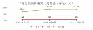 每500克面粉零售价格为2元,粳米价格3.9元,菜籽油每桶(5L)价格83元,调和油价格76元。与上月相比:米面油价格基本保持不变。与上年同期相比:面粉价格下降9.09%,粳米上涨11.43%,菜籽油上涨32.17%,调和油价格持平。(如下图)