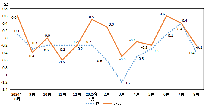 2025年8月份,张掖居民消费价格同比下降0.4%。其中,食品价格下降4.4%,非食品价格上涨0.5%;消费品价格下降0.8%,服务价格上涨0.2%。