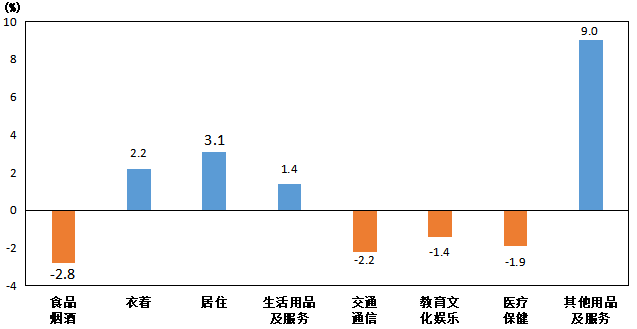 其他七大类价格同比“四涨三降”。其中,其他用品及服务类价格上涨9.0%,居住类价格上涨3.1%,衣着类价格上涨2.2%,生活用品及服务类价格上涨1.4%;交通通信类价格下降2.2%,医疗保健类价格下降1.9%,教育文化娱乐类价格下降1.4%。