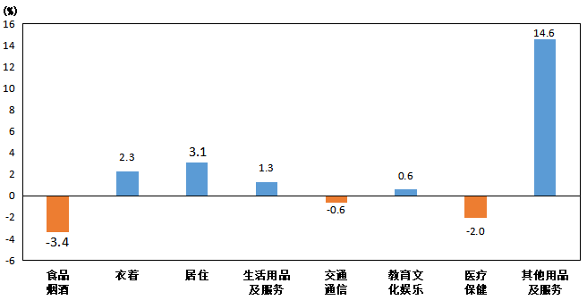 其他七大类价格同比“五涨二降”。其中,其他用品及服务类价格上涨14.6%,居住类价格上涨3.1%,衣着类价格上涨2.3%,生活用品及服务类价格上涨1.3%,教育文化娱乐类价格上涨0.6%;医疗保健类价格下降2.0%,交通通信类价格下降0.6%。