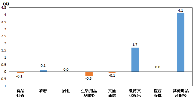 其他七大类价格环比“三涨二降二平”。其中,其他用品及服务类价格上涨4.1%,教育文化娱乐类价格上涨1.7%,衣着类价格上涨0.1%;生活用品及服务类下降0.3%,交通通信类价格下降0.1%;居住、医疗保健类价格持平。