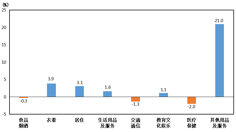 其他七大类价格同比“五涨二降”。其中,其他用品及服务类价格上涨21.0%,衣着类价格上涨3.9%,居住类价格上涨3.1%,生活用品及服务类价格上涨1.6%,教育文化娱乐类价格上涨1.1%;医疗保健类价格下降2.0%,交通通信类价格下降1.3%。