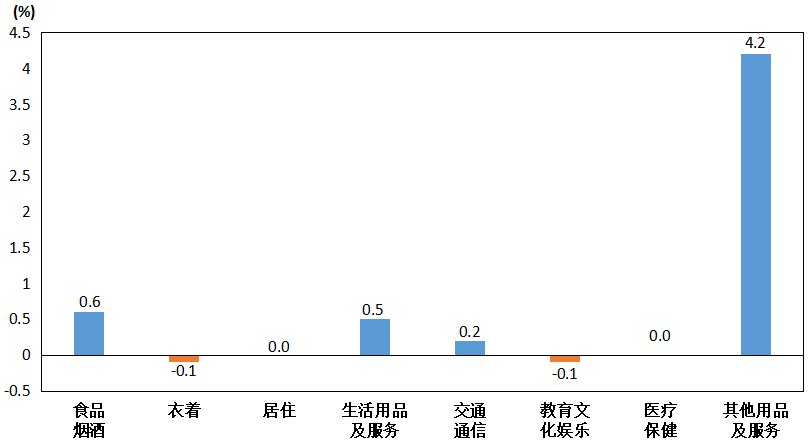其他七大类价格环比“三涨二降二平”。其中,其他用品及服务类价格上涨4.2%,生活用品及服务类价格上涨0.5%,交通通信类价格上涨0.2%;衣着、教育文化娱乐类价格均下降0.1%;居住、医疗保健类价格持平。