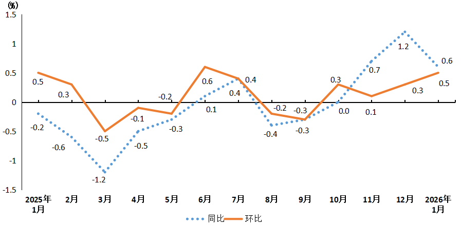 2026年1月份,张掖居民消费价格同比上涨0.6%。其中,食品价格下降0.1%,非食品价格上涨0.7%;消费品价格上涨0.2%,服务价格上涨1.1%。