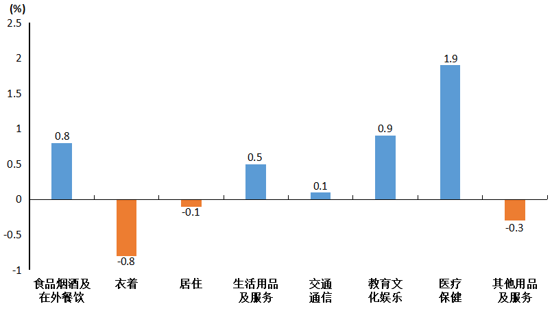 其他七大类价格环比“四涨三降”。其中,医疗保健类价格上涨1.9%,教育文化娱乐类价格上涨0.9%,生活用品及服务类价格上涨0.5%,交通通信类价格上涨0.1%;衣着类价格下降0.8%,其他用品及服务类价格下降0.3%,居住类价格下降0.1%。