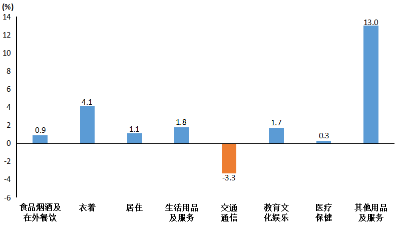 其他七大类价格同比“六涨一降”。其中,其他用品及服务类价格上涨13.0%,衣着类价格上涨4.1%,生活用品及服务类价格上涨1.8%,教育文化娱乐类价格上涨1.7%,居住类价格上涨1.1%,医疗保健类价格上涨0.3%;交通通信类价格下降3.3%。