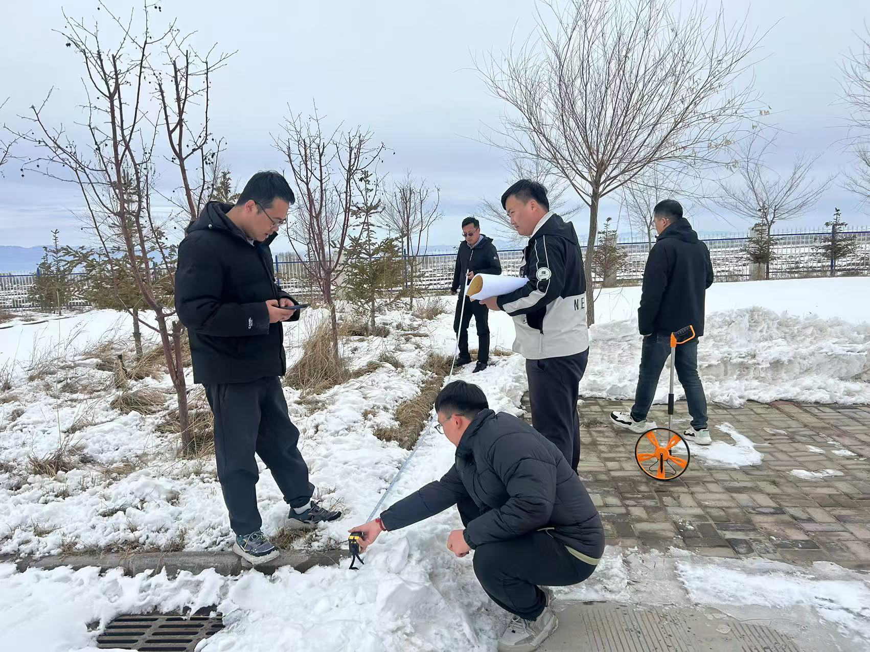 图为审计人员在雪地中用测量工具仔细勘查工程实体