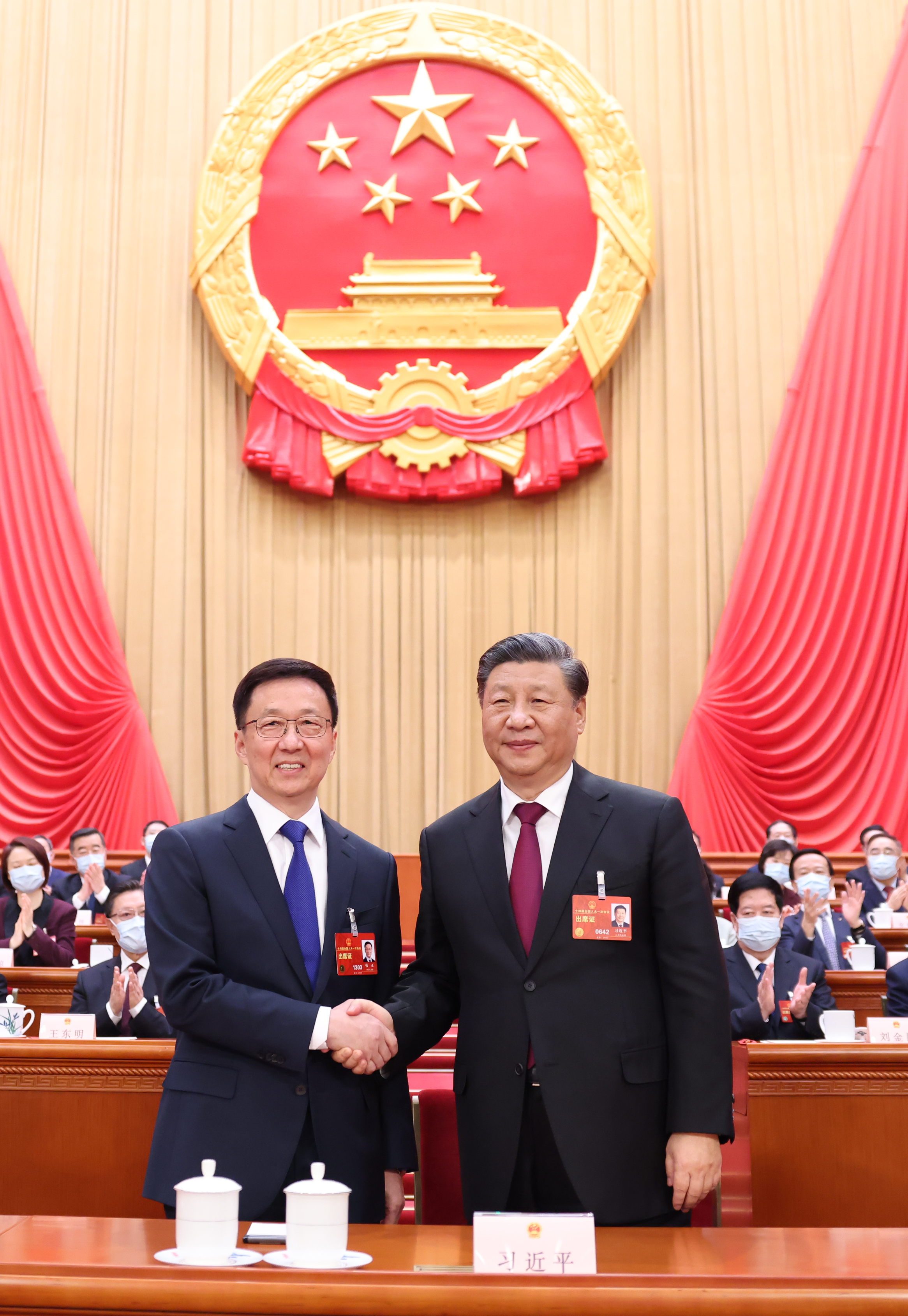 在掌声中,新当选的国家副主席韩正起身,向代表们鞠躬致意。随后,他走向习近平,两人亲切握手,习近平向他表示祝贺。韩正又同王岐山同志握手,相互致意。