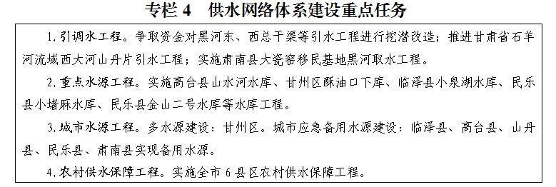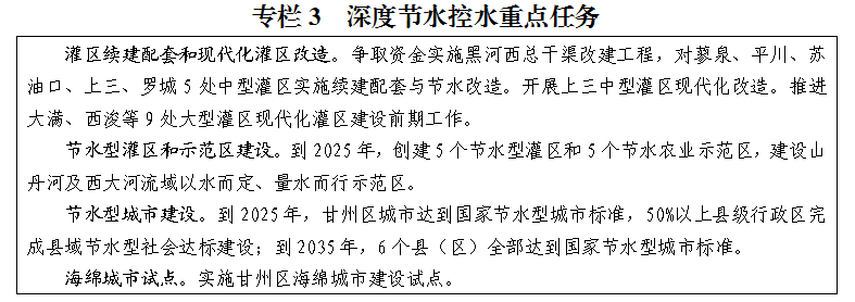 推进城镇节水降损。推进节水型城市建设,提高城市节水工作系统性,将节水落实到城市规划、建设、管理各环节。重点抓好污水再生利用,提升再生水利用水平,鼓励构建城镇良性水循环系统。深入开展公共领域节水,城市绿化、生态景观等鼓励采用节水灌溉方式。推行城乡供水一体化,加强农村生活供用水设施改造及配套管网建设,推广节水器具。2025年,甘州区达到国家节水型城市标准,50%以上县级行政区完成县域节水型社会达标建设。