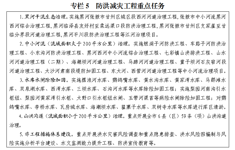 防洪减灾工程体系逐步完善。坚持工程与管理相结合,防洪减灾体系逐步完善,黑河干流防洪治理工程持续实施,重点区域达到防洪标准,洪水灾害防御能力不断增强;推进病险水库(闸)除险加固、山洪灾害防治等工程建设,建成覆盖六县(区)的山洪灾害监测预警系统,水旱灾害监测预警及河流洪水风险管理水平持续提高,自然灾害抵御的能力得到增强,水旱灾害对经济社会发展的影响大幅减轻。