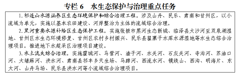 水环境治理能力显著增强。科学规划水治理体系,逐步完善水系工程布局,全面落实河湖长制,河湖健康生命得到维护。通过小流域综合治理、祁连山黑河流域山水林田湖草生态保护与修复、祁连山水源涵养区生态保护等项目的实施,水源涵养能力不断增强,河流生态水平得到持续提升;祁连山生态保护成效显著,全市引水式水电站全面实现生态流量在线监测。