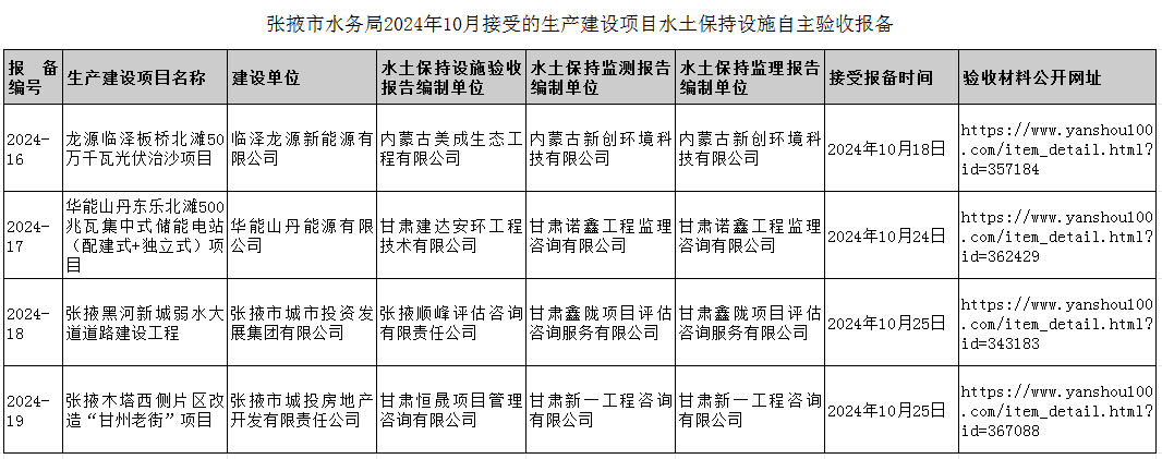 根据《国务院关于取消一批行政许可事项的决定》(国发〔2017〕46号)、《水利部关于加强事中事后监管规范生产建设项目水土保持设施自主验收的通知(水保〔2017〕365号)、甘肃省水利厅关于《加强事中事后监管规范生产建设项目水土保持设施自主验收实施意见》(甘水水保发〔2017〕381号)的有关规定,现就2024年10月我局接受的生产建设项目水土保持设施自主验收报备有关情况予以公告。