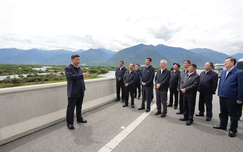 7月21日至23日,中共中央总书记、国家主席、中央军委主席习近平来到西藏,祝贺西藏和平解放70周年,看望慰问西藏各族干部群众。这是21日上午,习近平在林芝尼洋河大桥考察雅尼湿地。新华社记者 李学仁 摄