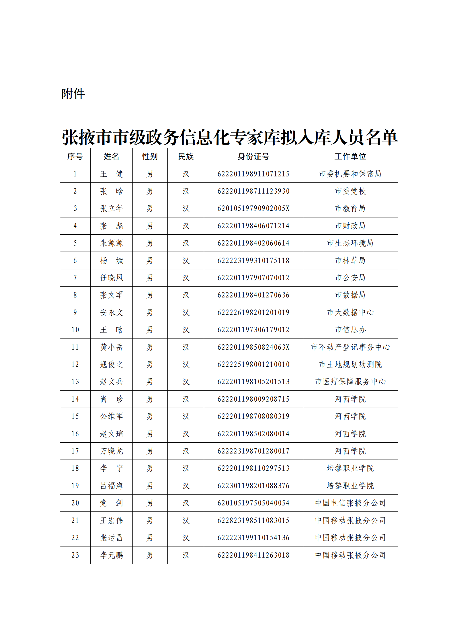 按照《关于征集市级政务信息化专家的通知》(张数函〔2026〕2号)相关要求,经单位申报、材料审核、会议研究,确定市级政务信息化专家库拟入库人员23名(名单附后),现予公示。若有异议,请于公示期间来电、来访或来信反映。