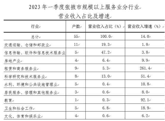 (二)重点企业支撑有力。一季度,全市规模以上服务业企业中,中国电信股份有限公司张掖分公司、中国移动通信集团甘肃有限公司张掖分公司、中国邮政集团有限公司张掖市分公司、中国联合网络通信有限公司张掖市分公司、张掖市龙腾石油工程技术服务有限公司等10户企业合计实现营业收入同比增长13.1%,占规上服务业营业收入的70.3%,拉动规上服务业营业收入增长9.2个百分点。其中四大通讯运营商营业收入同比增长8.4%,占规上服务业营业收入的46.9%,拉动规上服务业营业收入增长4.1个百分点。