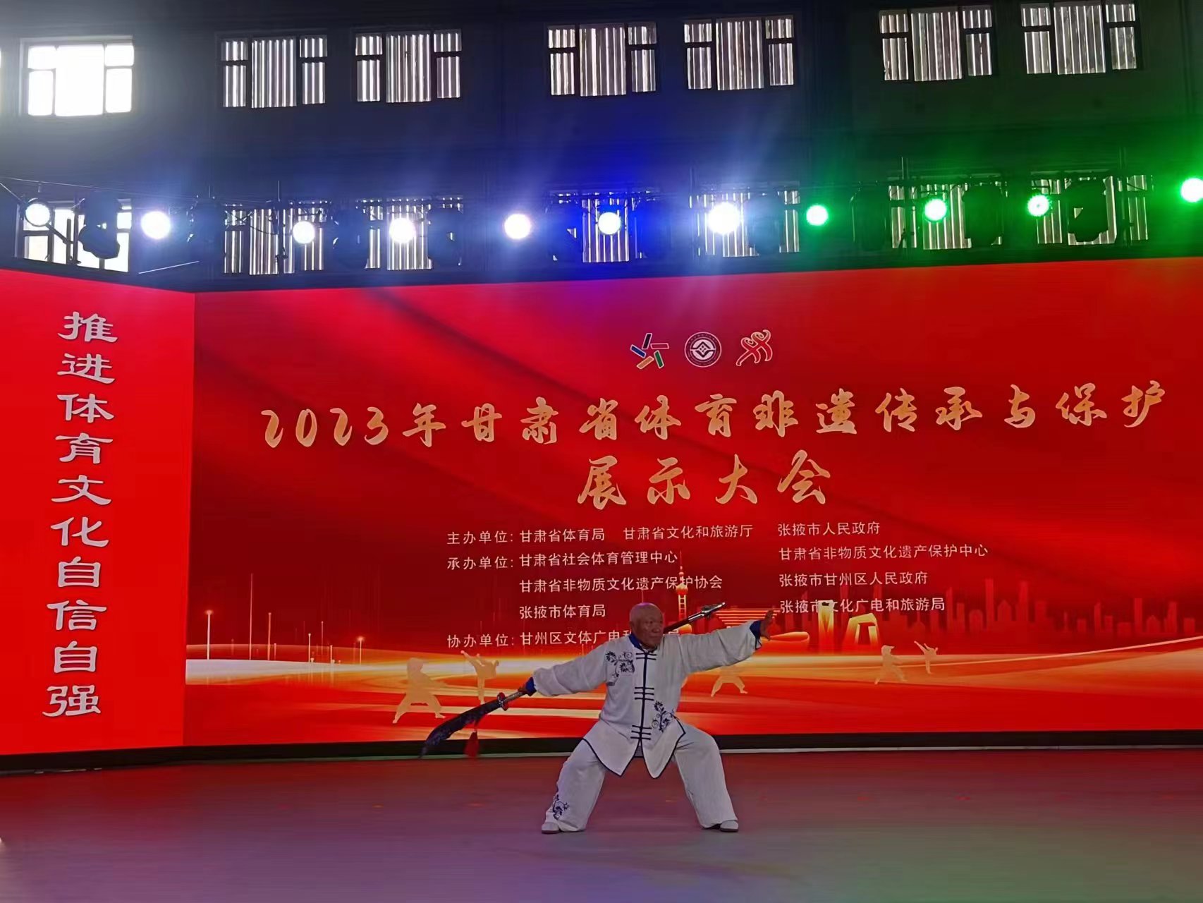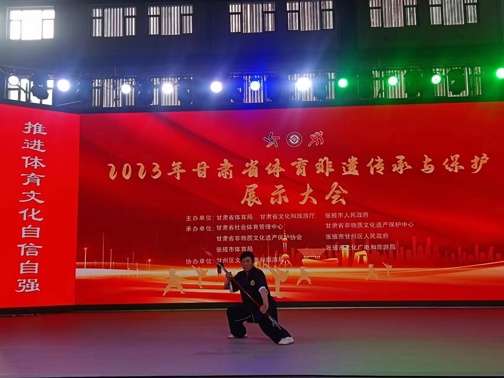 2023年甘肃省体育非遗传承与保护展示大会于10月14日至17日在张掖市甘州区举行。民乐县最具代表性的省级非物质文化遗产四家武术再次亮相于省级舞台。此次展示大会以四家武术春秋大刀、进山棍、劈挂拳、二掌目子等传统体育为展评内容,突出展演的集体性、艺术性和观赏性,旨在让传统体育非遗项目活起来,展示我县深厚的文化内涵和魅力。