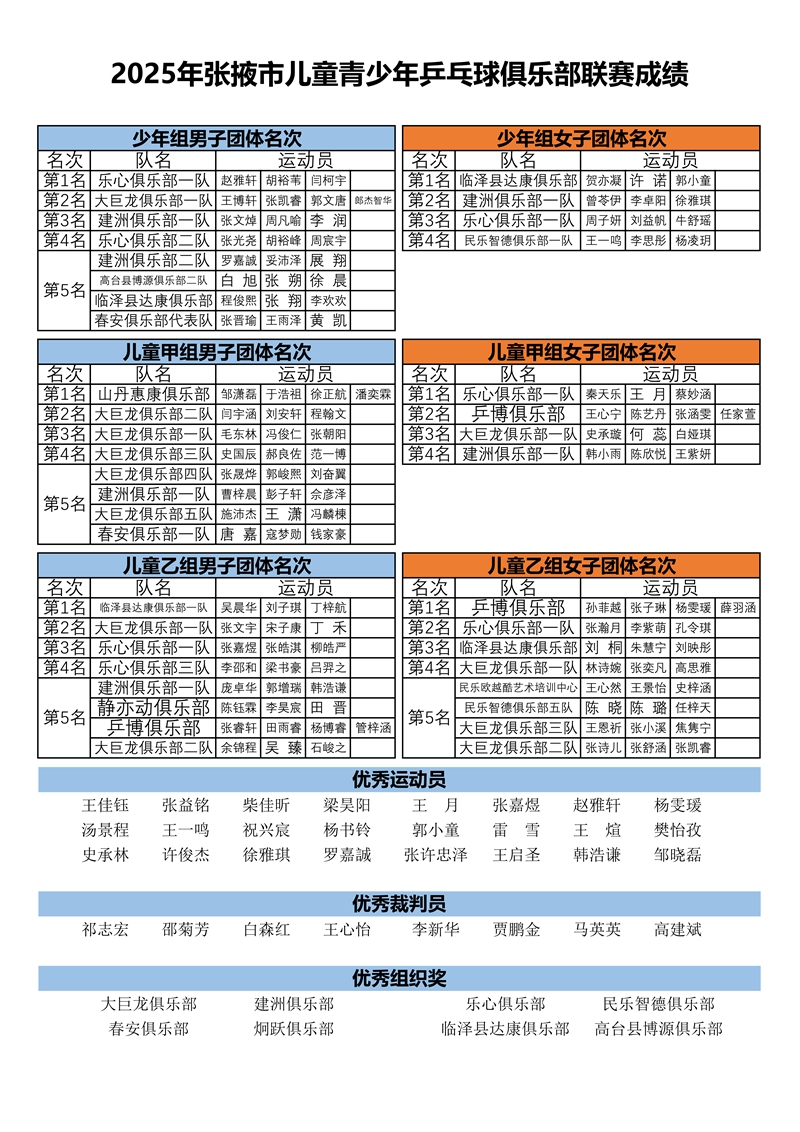 11月30日,“奔跑吧·少年”儿童青少年主题健身活动暨2025年张掖市少年儿童乒乓球俱乐部联赛在甘州区体育馆圆满落下帷幕。本次联赛由张掖市体育局主办,甘州区文体广电和旅游局、张掖市乒乓球运动协会承办,张掖大巨龙体育文化传播有限公司协办。