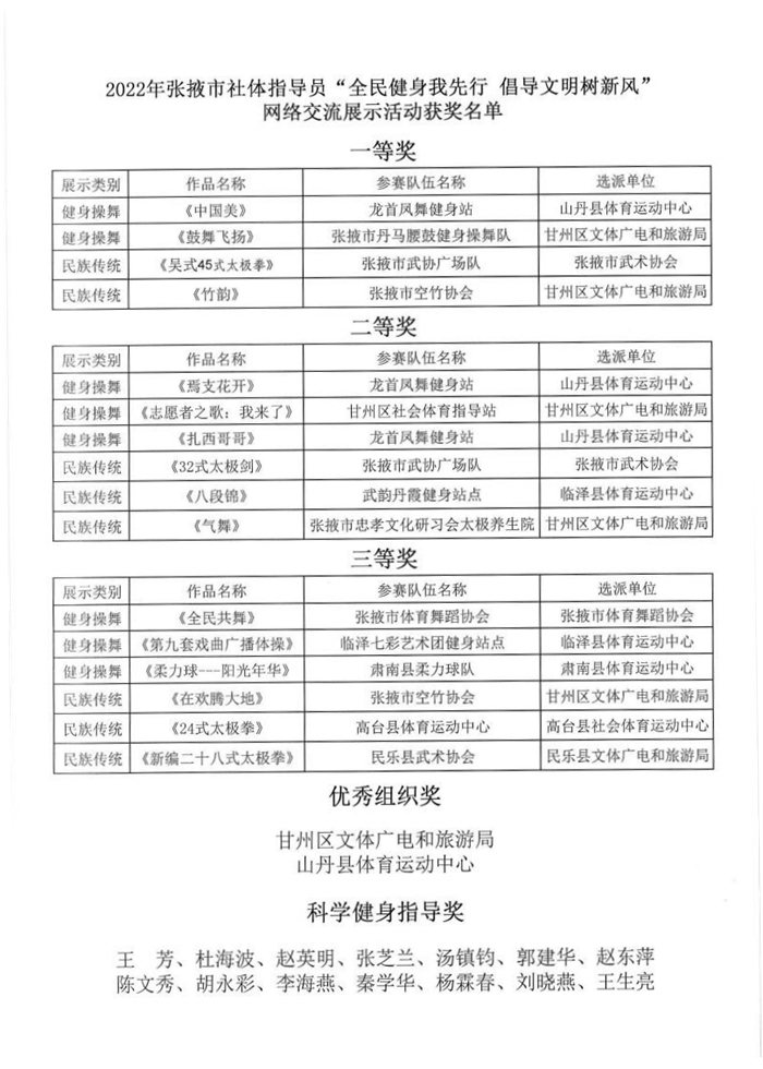 2022年张掖市社体指导员“全民健身我先行 倡导文明树新风”网络交流展示活动由张掖市体育局主办,张掖市体育总会、张掖市体社会体育管理及体育产业促进中心承办,根据评审小组评审结果,现将评选出的各奖项获奖名单予以公示。获奖单位、个人获奖证书及奖牌将邮寄至各组队单位。