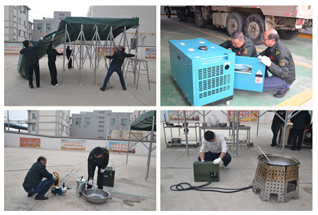 演练采取开会动员部署、制定演练科目、细化应急预案、明确操作流程、分组集结筹备等措施。在指令下达时,全体参演人员迅速集结,分两个专项小组在30分钟内完成两顶帐篷搭建、固定,各操作区划分、物品归置等流程,高效完成营地搭建。按照预先设置的“三断”场景,全体人员按照给水保障组、电力保障组、热食制作保障组的分工,各司其职、分头行动,有序开展应急处置工作。给水保障组携带移动净水设备,在附近寻找天然水源并完成了净化处理;电力保障组在5分钟内完成发电机组调试并恢复供电;热食保障组同步启用柴火灶、液化气灶和野外应急保障单元展开作业。各环节紧密配合、分工协作、迅速处置,全面检验了在突发情况下应急预案的可操作性和应急设备器材的适用性。