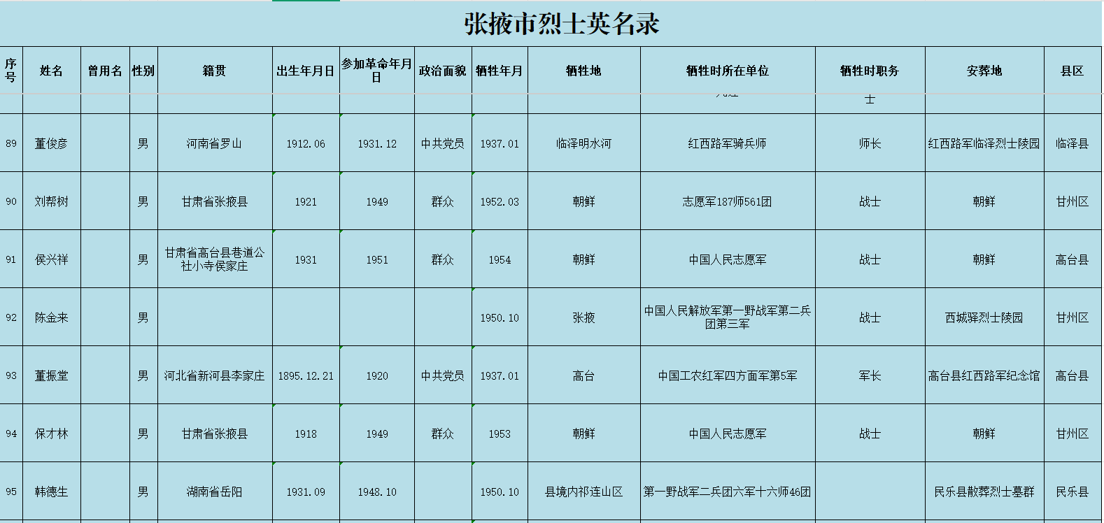 张掖市烈士英名录