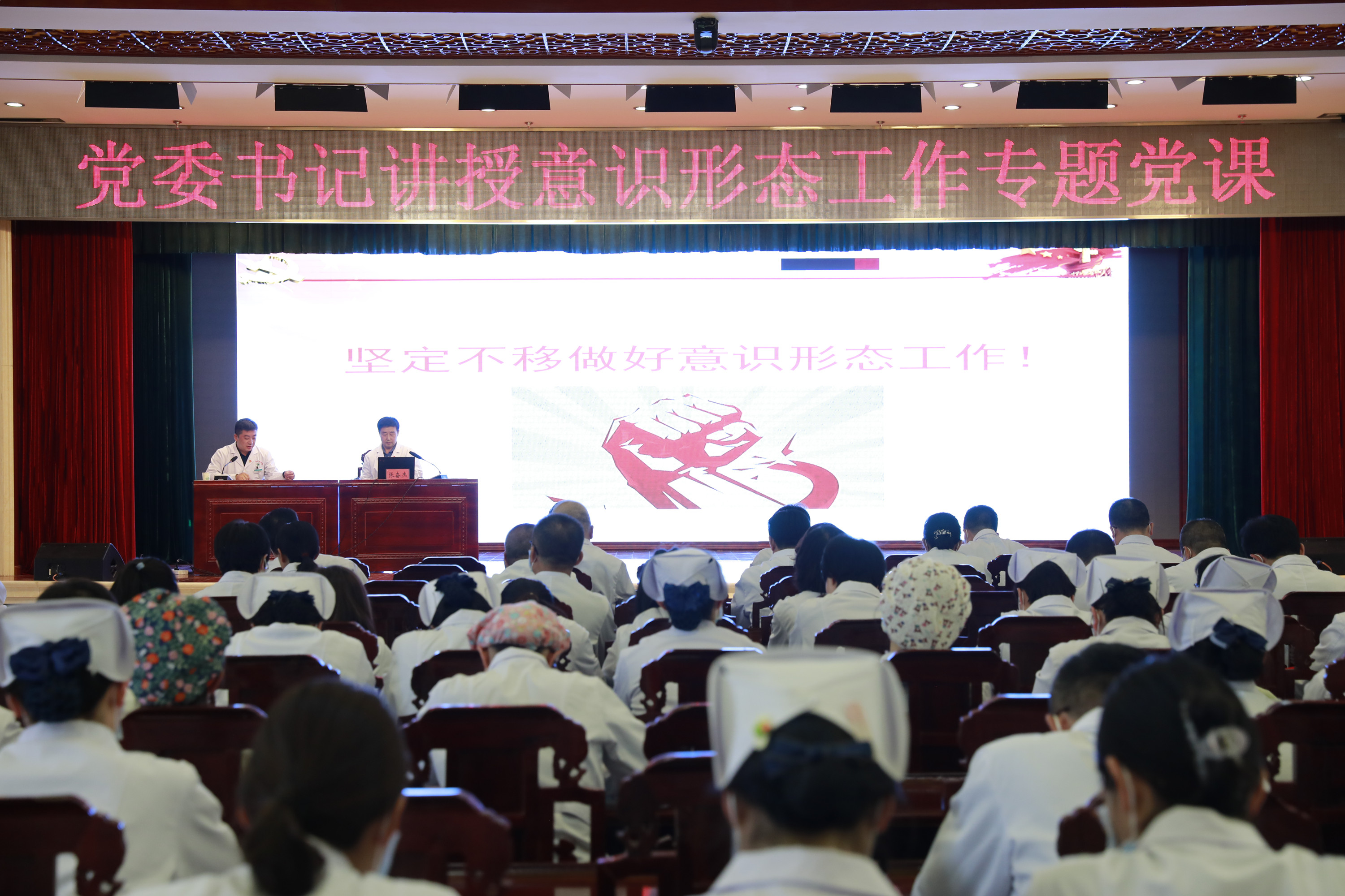 为进一步增进全院干部职工对意识形态工作的认识和理解,提高做好意识形态工作的能力和水平,3月30日,张掖市中医医院党委书记张奋杰以《意识形态——没有硝烟的战争》为题,结合习近平总书记关于意识形态工作重要论述,紧扣医院工作实际,从充分认识意识形态工作的极端重要性、当前意识形态领域面临的风险挑战、进一步加强意识形态工作的主要思路和措施三个方面讲授了一堂理论内容翔实、实践举例生动、形式深入浅出的专题党课。党委委员、副院长张居东主持,党委班子成员、中层干部、在院党员及医务人员代表约200余人参加。