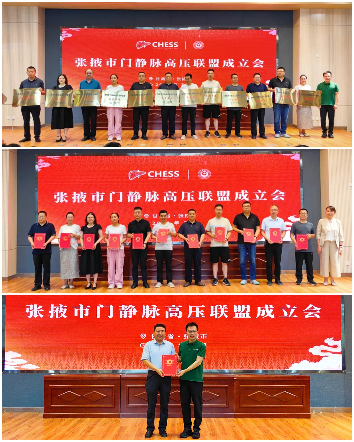 CHESS肝脏健康联盟创始人、教育部“长江学者”祁小龙向张掖市门静脉高压诊疗联盟成员单位授牌;CHESS肝脏健康联盟创始人、教育部“长江学者”祁小龙向张掖市门静脉高压诊疗联盟首届理事长赵致臻颁发聘书;甘肃省门静脉高压联盟理事长、兰州大学第一医院副院长、东岗分院院长张立婷向张掖市门静脉高压诊疗联盟理事会成员颁发聘书。