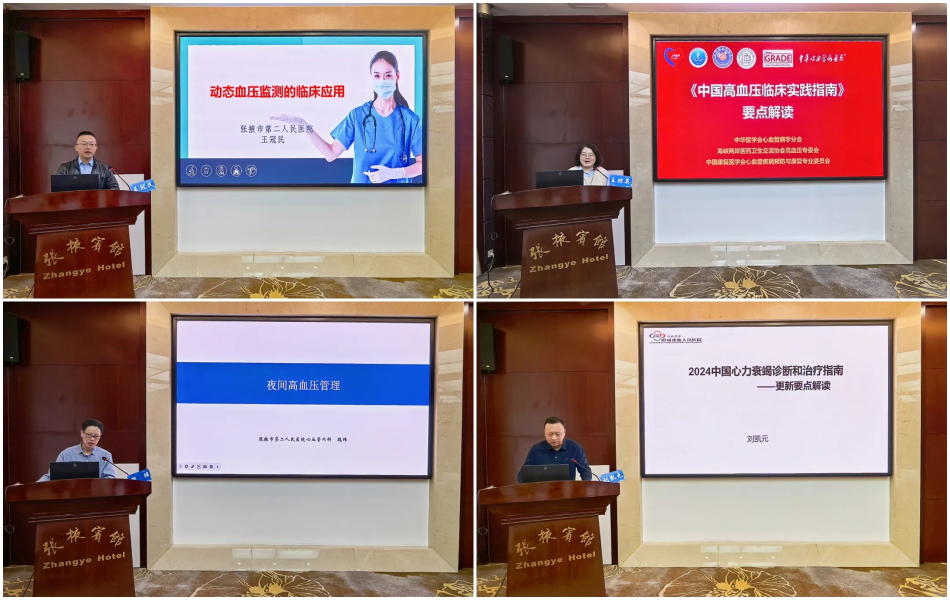 会议由甘肃省人民医院心血管内科主任兼一病区主任谢萍及张掖市高血压质控中心主任、张掖市第二人民医院心血管内科病区主任魏玮主持。张掖市第二人民医院党委委员、副院长张阳出席会议并致辞。兰州大学第二医院心血管内科主任医师王琼英,河西学院附属张掖人民医院主任医师杨威、主任医师刘凯元,张掖市第二人民医院心血管内科病区主任魏玮、心内二科及老年病管理病区主任王冠民出席会议并现场授课。