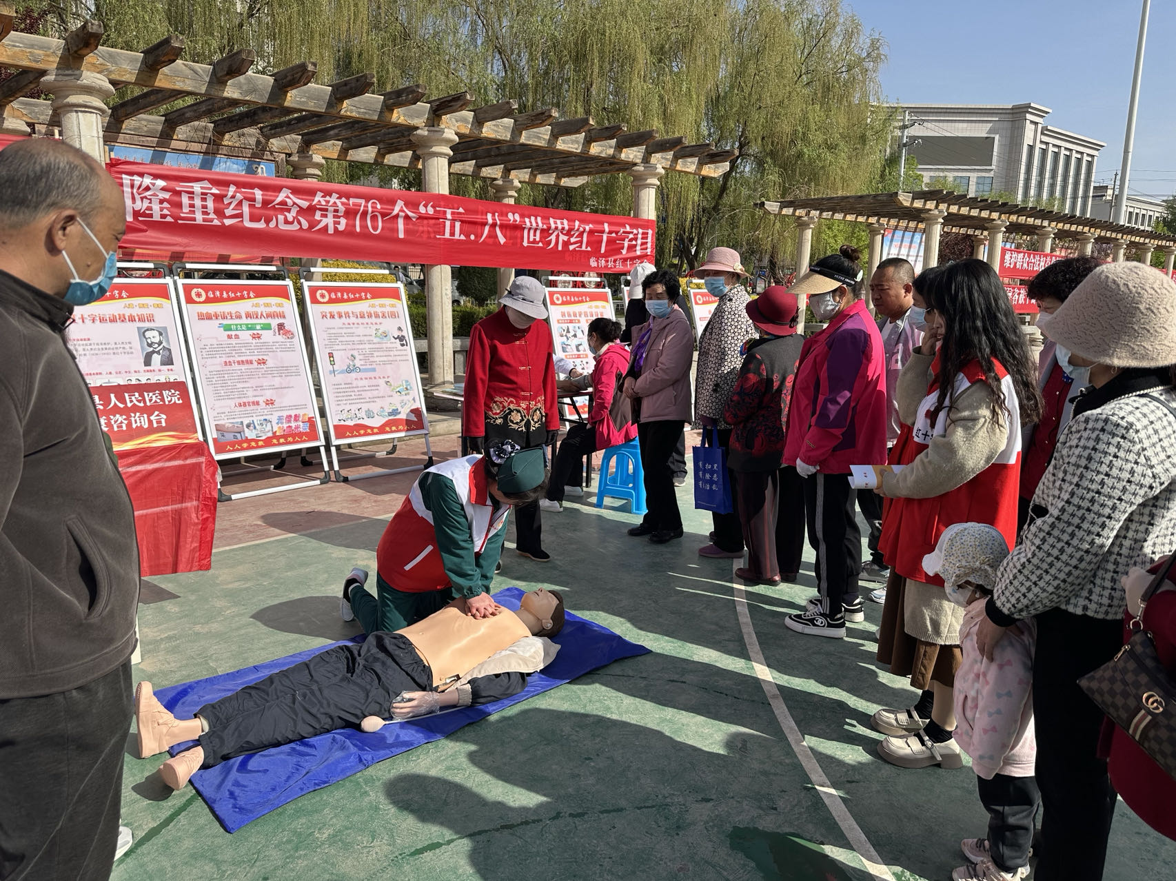 活动现场通过摆放宣传展板、设置义诊服务台、悬挂横幅、发放宣传资料、现场急救演示等多种形式,为群众进行义诊咨询服务,向群众讲解无偿献血、造血干细胞捐献、遗体(器官)捐献等方面的知识。同时,县人民医院、县中医医院红十字志愿者现场为居民进行心肺复苏、创伤包扎、气道异物梗阻操作等急救知识技能演练。