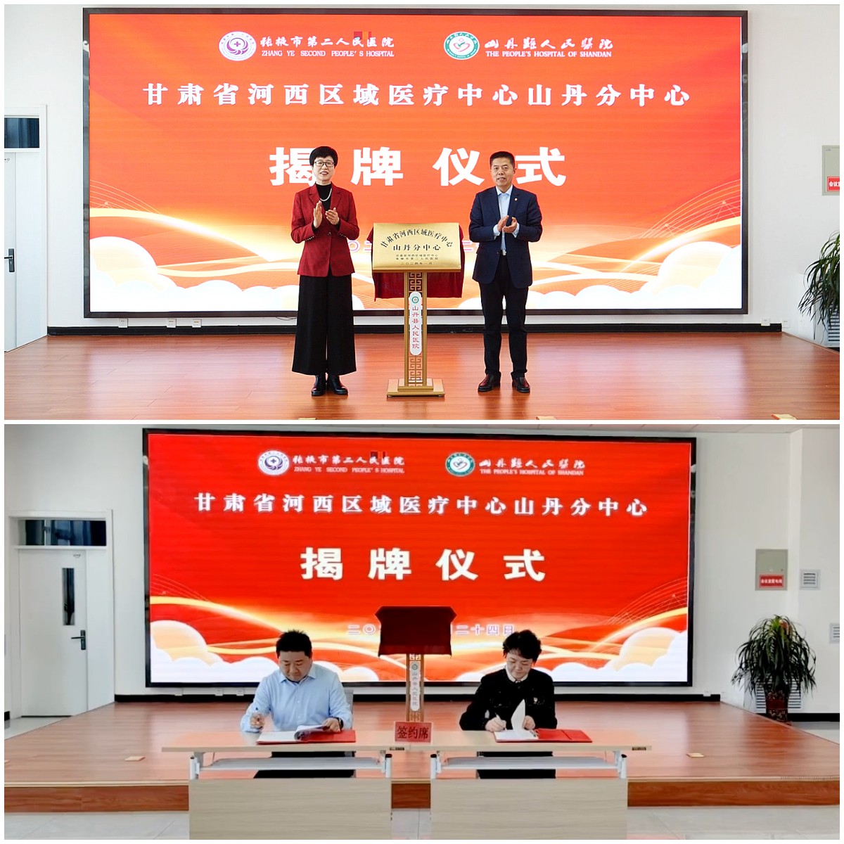 揭牌签约仪式上,山丹县委书记王韶华,张掖市卫生健康委员会党组书记、主任殷鸿雁共同为甘肃省河西区域医疗中心山丹分中心揭牌。张掖市第二人民医院院长赵致臻,山丹县人民医院院长张德琴共同签订《张掖市第二人民医院支持山丹县人民医院建设甘肃省河西区域医疗中心山丹分中心协议书》。