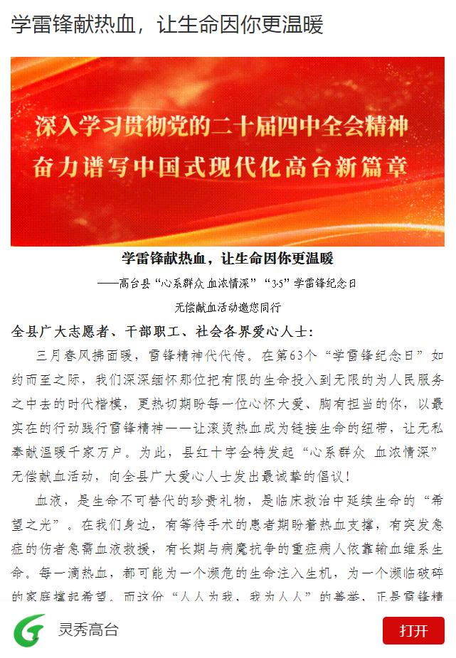 倡议无偿献血为生命续航。3月3日,县卫健局联合红十字会发布“学雷锋献热血,让生命因你更温暖——高台县‘心系群众 血浓情深’‘3∙5’学雷锋纪念日无偿献血活动倡议书”,向干部群众科普无偿献血知识,解读献血惠民政策,呼吁党员干部职工、志愿者及社会各界爱心人士以雷锋为榜样,用热血传递温暖,用奉献诠释担当,让“人人为我,我为人人”的善举蔚然成风,为文明城市创建增添厚重底色。