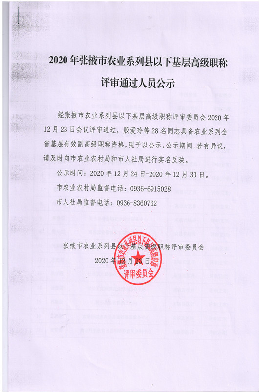2020年张掖市农业系列县级以下基层有效高级职称评审通过人员公示