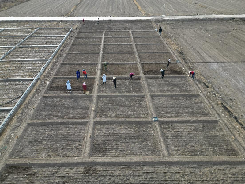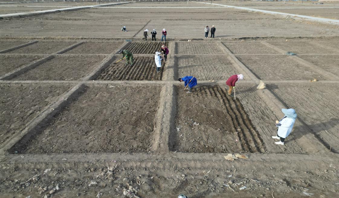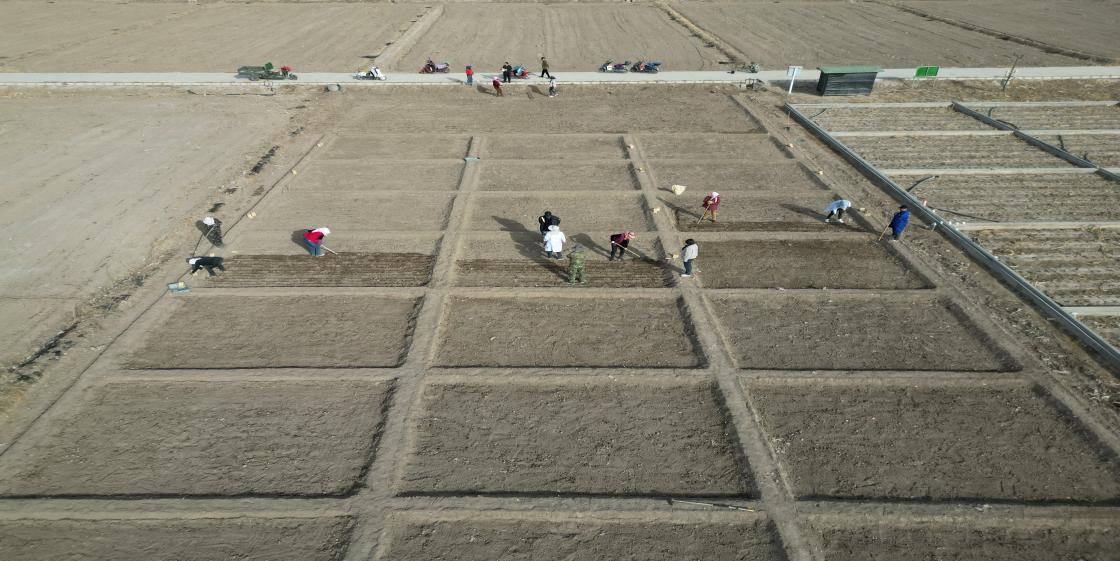 从高空俯瞰,试验田被规整划分成多个区域,科研人员身着不同颜色的工作服,手持工具,专注于每一个操作环节,严谨细致完成节水试验小区划分及播种工作。