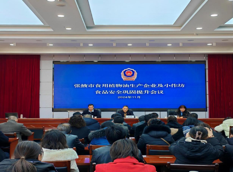 为进一步规范食用植物油生产行为,切实保障广大人民群众饮食安全,11月28日,张掖市市场监管局召开了食用植物油生产企业及小作坊食品安全巩固提升会。市局党组成员、副局长李栋主持会议并讲话,市局调研员、食品生产流通科同志,各县区局食品生产负责人,全市食用植物油生产企业及小作坊负责人、食品安全总监、食品安全员60余人参加会议。
