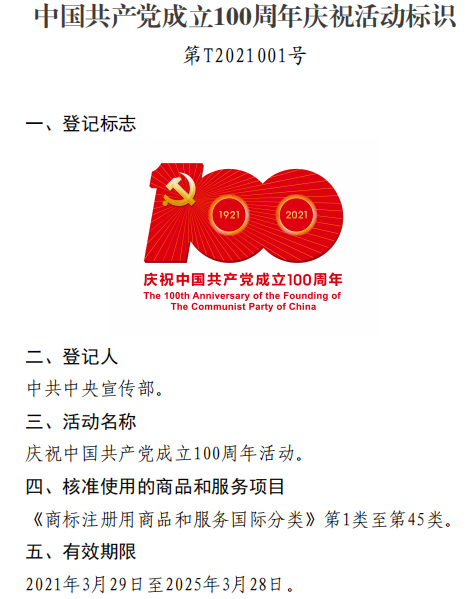 国家知识产权局依据《特殊标志管理条例》,对中国共产党成立100周年庆祝活动标识特殊标志予以核准登记。公告号:第412号。