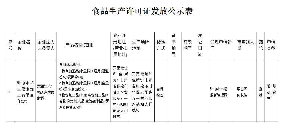 根据《中华人民共和国食品安全法》、《食品生产许可管理办法》等法律法规的规定,我局依照《食品生产许可审查通则》和相关《食品生产许可审查细则》,张掖市祁玉黑燕麦加工有限责任公司生产许可申请符合变更条件,现予以公示(公示时间:2021年9月6日至2021年9月10日),请社会各界予以监督。
