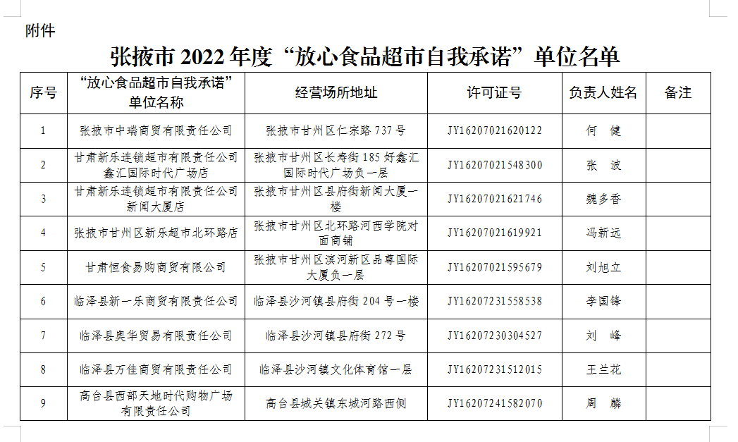 附件:张掖市2022年“放心食品超市自我承诺”单位名单