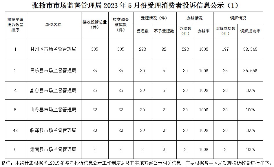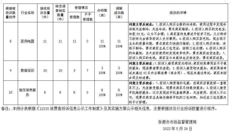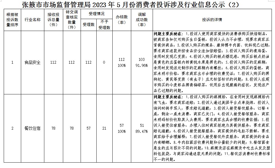 根据《中华人民共和国消费者权益保护法》有关规定及消费者投诉信息公示制度的要求,现将张掖市市场监督管理系统2023年5月份各县区局受理投诉情况、投诉比较集中的行业公示如下: