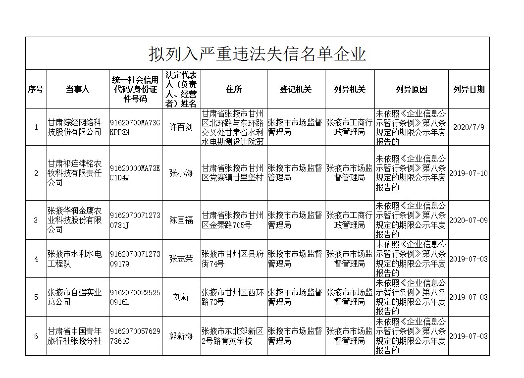 经查,甘肃综经网络科技股份有限公司等6户企业,被列入经营异常名录届满三年仍未履行相关义务,依据《市场监督管理严重违法失信名单管理办法》第十一条和《企业信息公示暂行条例》第十七条规定,拟将甘肃综经网络科技股份有限公司等6户企业列入严重违法失信企业名单(详见附件),通过国家企业信用信息公示系统公示,并实施相应管理措施。