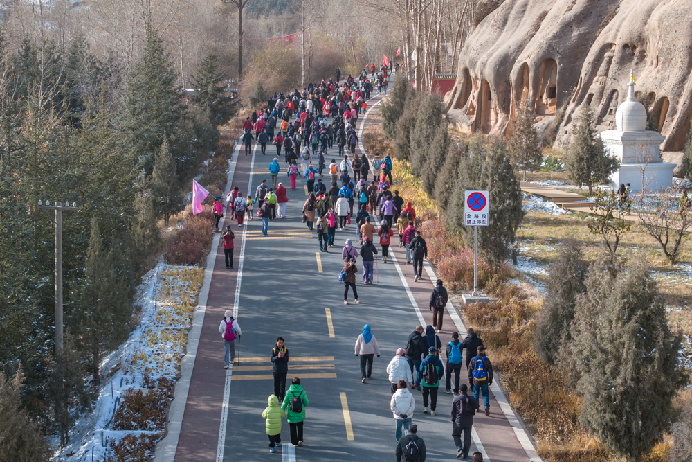 初冬的张掖,祁连雪山如黛染墨,马蹄石窟意蕴绵长。11 月8日,2025年“双11”全国持杖行走联动日(张掖肃南站)活动在肃南裕固族自治县马蹄石窟群旅游区盛大启幕,来自张掖及周边省市的500多名户外徒步爱好者齐聚一堂,在这片兼具雄奇地貌与灵秀景致的土地上,共同开启一场融合运动活力与自然之美的户外盛宴。