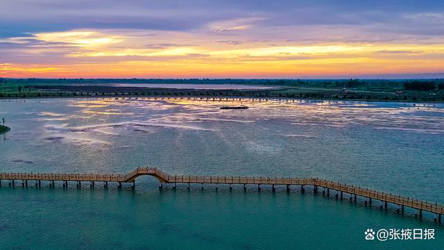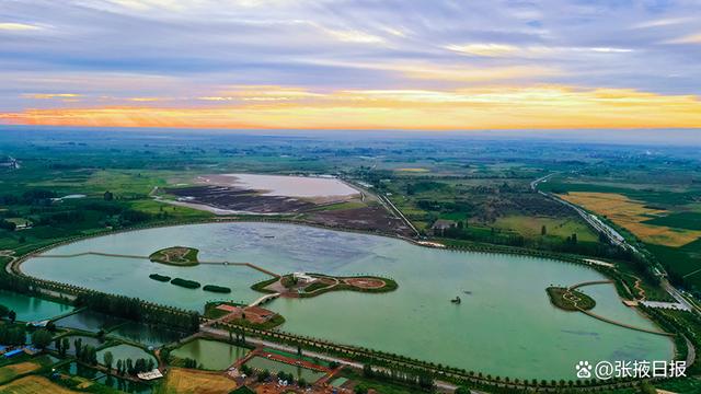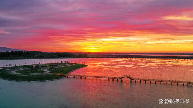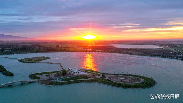 7月12日傍晚,夕阳西下,甘肃省临泽县曹家生态湖往西远眺,落日余晖染红天际,好似一幅美丽图画。(张希清摄)