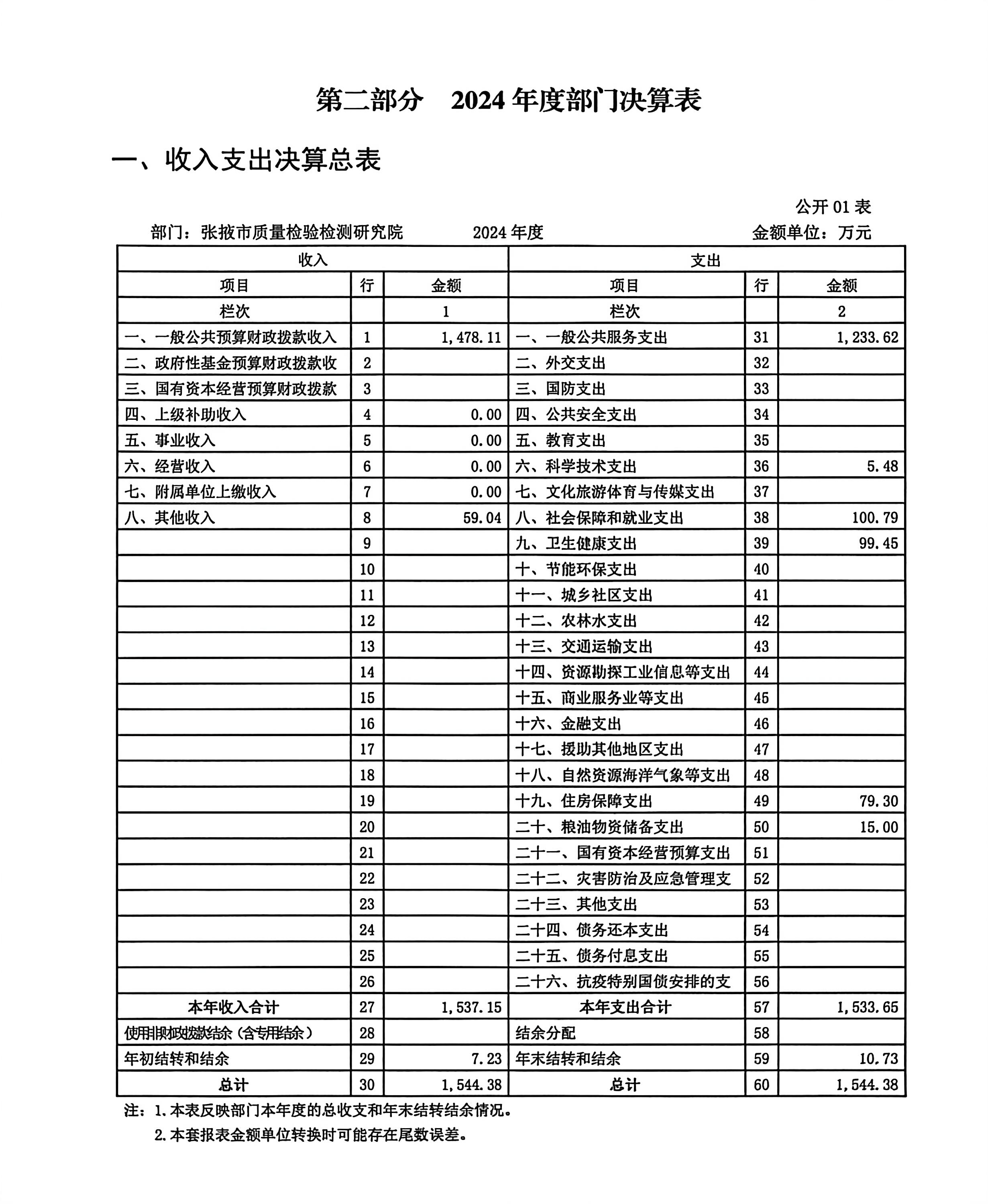 2024年度收、支总计均为1544.38万元。与上年度相比 ,收、支总计各增加41.90万元,增长2.79%,主要原因:一是工资调增和社保缴费基数上涨,人员经费增加。二是县区单位上解的检验检测成本性经费增加。与年初预算数相比,收、支总计各增加407.6万元,增长35.86%。主要原因是:年中追加省、市专项经费预算;二是年中县区单位上解检验检测成本性经费。