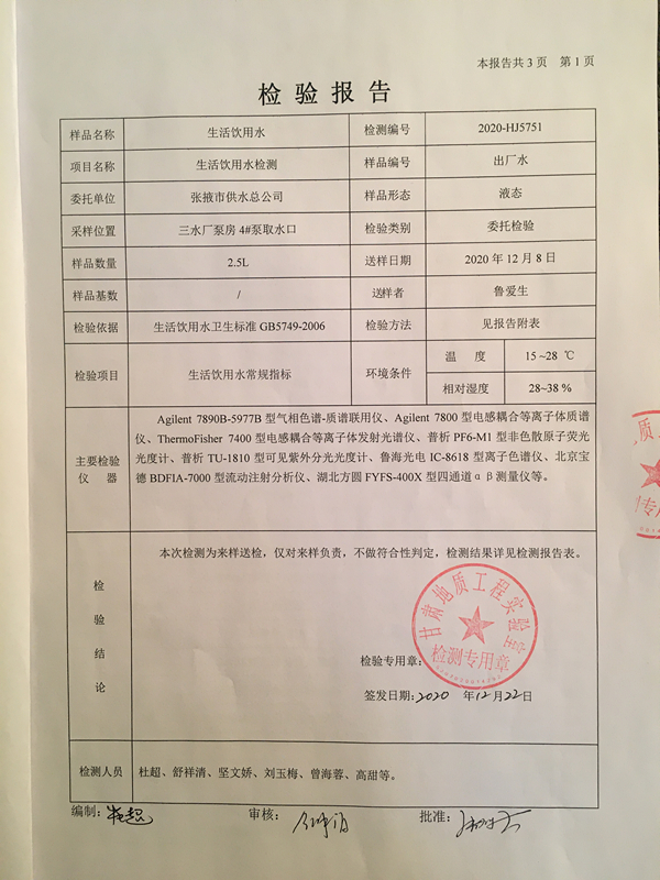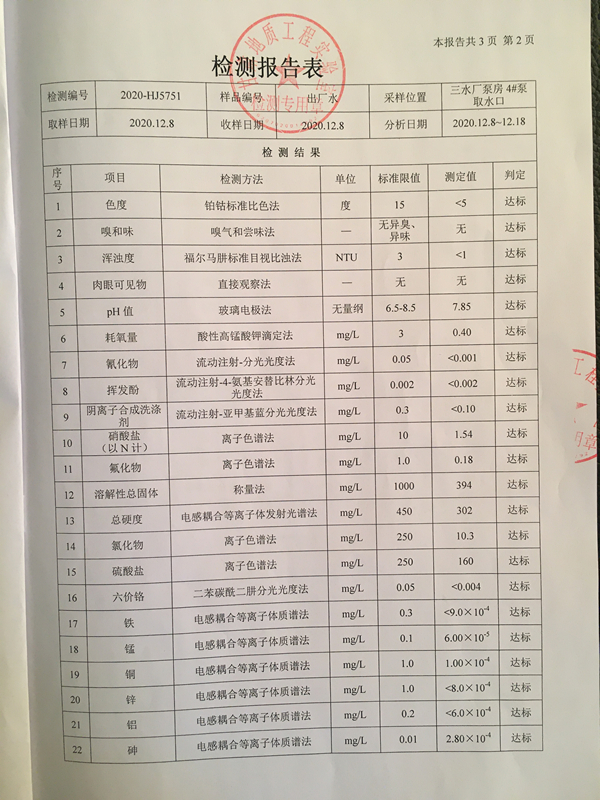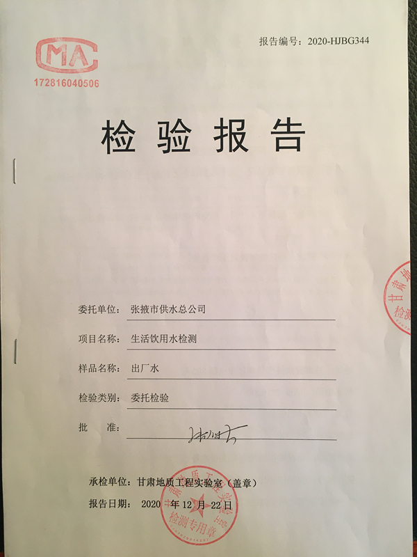 标题: 2020年第四季度城市出厂水水质检测报告
